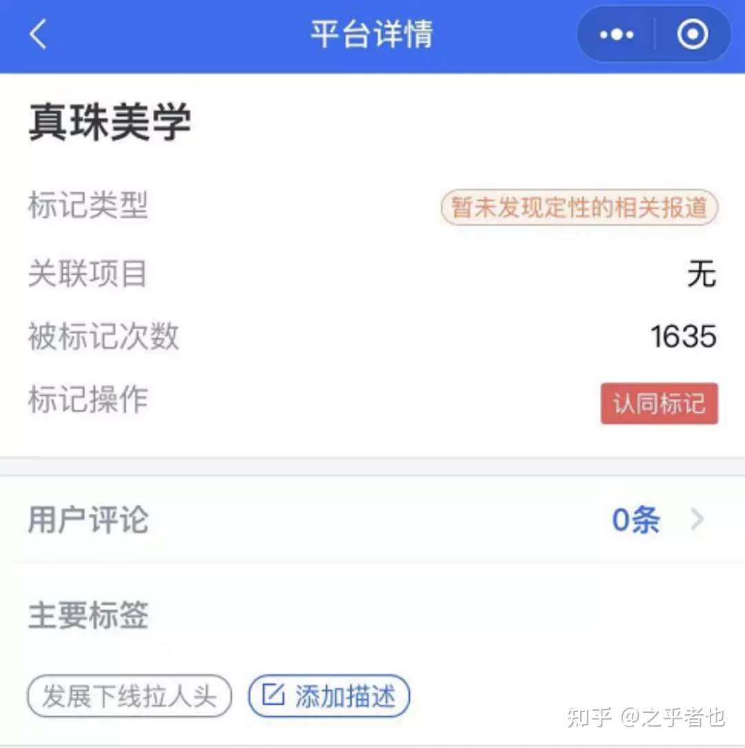 在灵鲲金融风险查询举报中心APP查询发现,真珠美学已经被标记了1635次,主要标签是“发展下线拉人头。”
