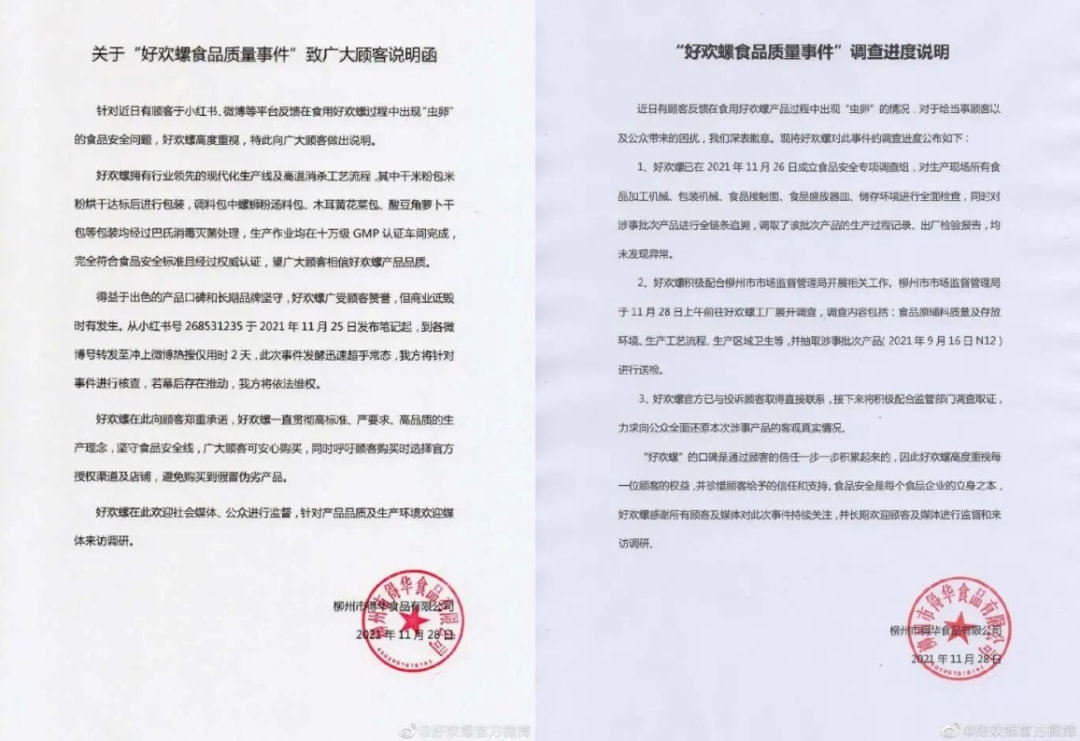11月28日晚,好欢螺再次发布说明,称已成立专项调查组对生产现场进行全面检查,同时对涉事批次产品进行全链条追溯,未发现异常。其还强调,已与投诉顾客取得直接联系,力求向公众全面还原本次涉事产品的客观真实情况。