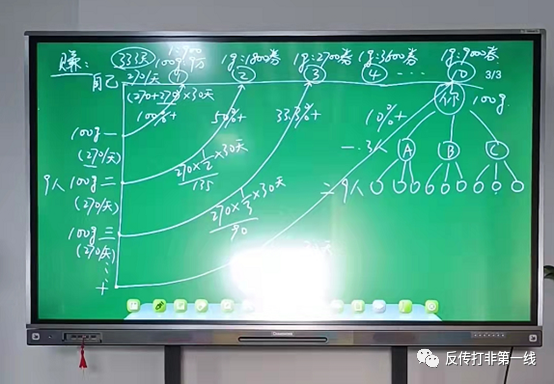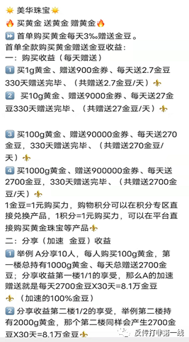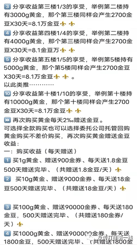 11月29日,一线君来到美华珠宝总部进行调查。在这里每个办公室都悬挂着不同的标牌。有标注“统战部”的,还有标注“华南”及“华西战区”的,名称令人感觉莫名其妙。而更另记者眼花缭乱,头晕目眩的是美华珠宝“传奇”的商业模式---“开宝箱”。美华珠宝“买黄金、送黄金、赚黄金”动静态商业模式如下:610元/克黄金,1g起投。赠送900金券,每天按照3‰返还。