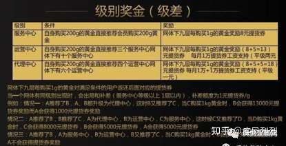 此外,公司还有级别奖金(级差),服务中心:自身购买200g的黄金直接推荐会员购买200g黄领,奖励网体下九层每购买1g的黄金奖励8元提货券;运营中心:自身购买200g的黄金直接推荐三个服务中心网体下有十个服务中心,奖励网体下九层每购买1g的黄金奖励(8+5=13)元提货券每月1万提货券工资支持(平级两元);代理中心自身购买200g的黄金直接推荐四个运营中心网体下有六个运营中心,奖励网体下九层每购买1g的黄金奖励(8+5+5=18 元提货券每月1万+1万提货券工资支持(平级一元)。