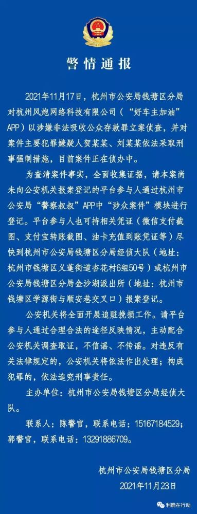 2021年11月23日,杭州市公安局钱塘区分局对外发布了关于“好车主加油” APP涉嫌非法吸收公众存款案的情况通报,具体如下: