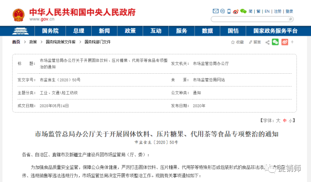早在2020年5月14日,市场监管总局办公厅发布通知《市场监管总局办公厅关于开展固体饮料、压片糖果、代用茶等食品专项整治的通知》。