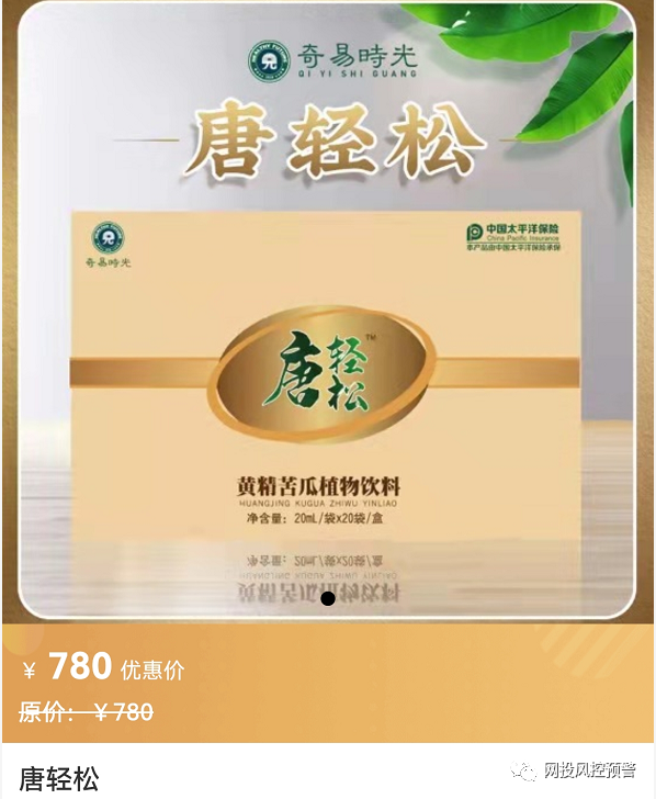 400毫升装奇易时光唐轻松黄精苦瓜固体饮料在东升奇易时光小程序中售价为780元/盒,经查询,该产品执行标准为GB/T31121,是果蔬汁类及其饮料产品标准。由此可见,唐轻松为普通食品类别。