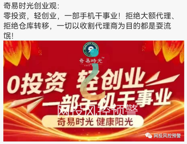 另外,在东升奇易时光小程序商城中发布于2021年4月23日的一则题为《奇易时光企业文化》一文中写道,奇易时光创业观:零投资、轻创业,一部手机干事业......