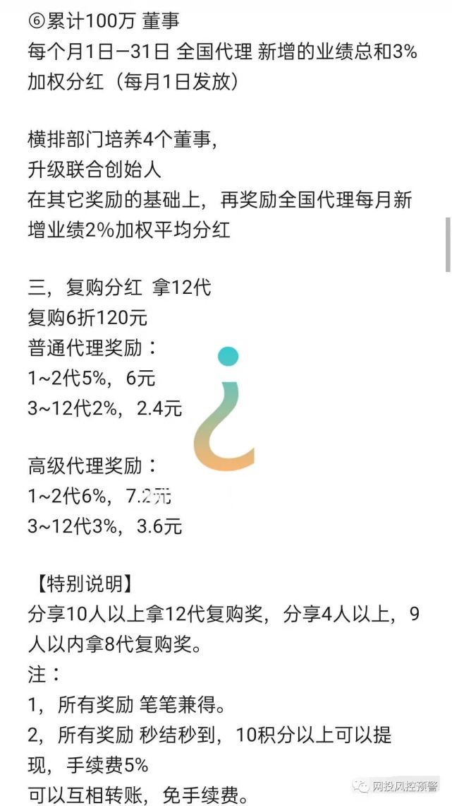 三,复购分红 拿12代复购6折120元普通代理奖励:1~2代5%,6元;3~12代2%,2.4元。