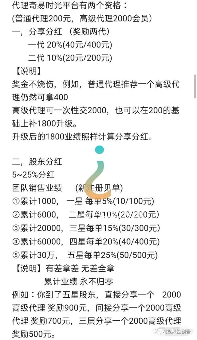 代理奇易时光有两个资格:普通代理200元,高级代理2000会员。