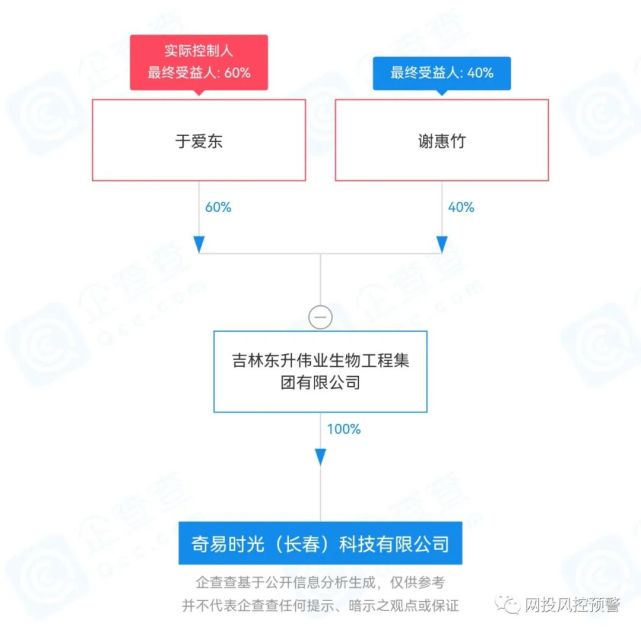 根据企查查APP数据显示,奇易时光(长春)科技有限公司成立于2021年7月2日,法人于某某,吉林东升伟业生物工程集团有限公司持股100%。