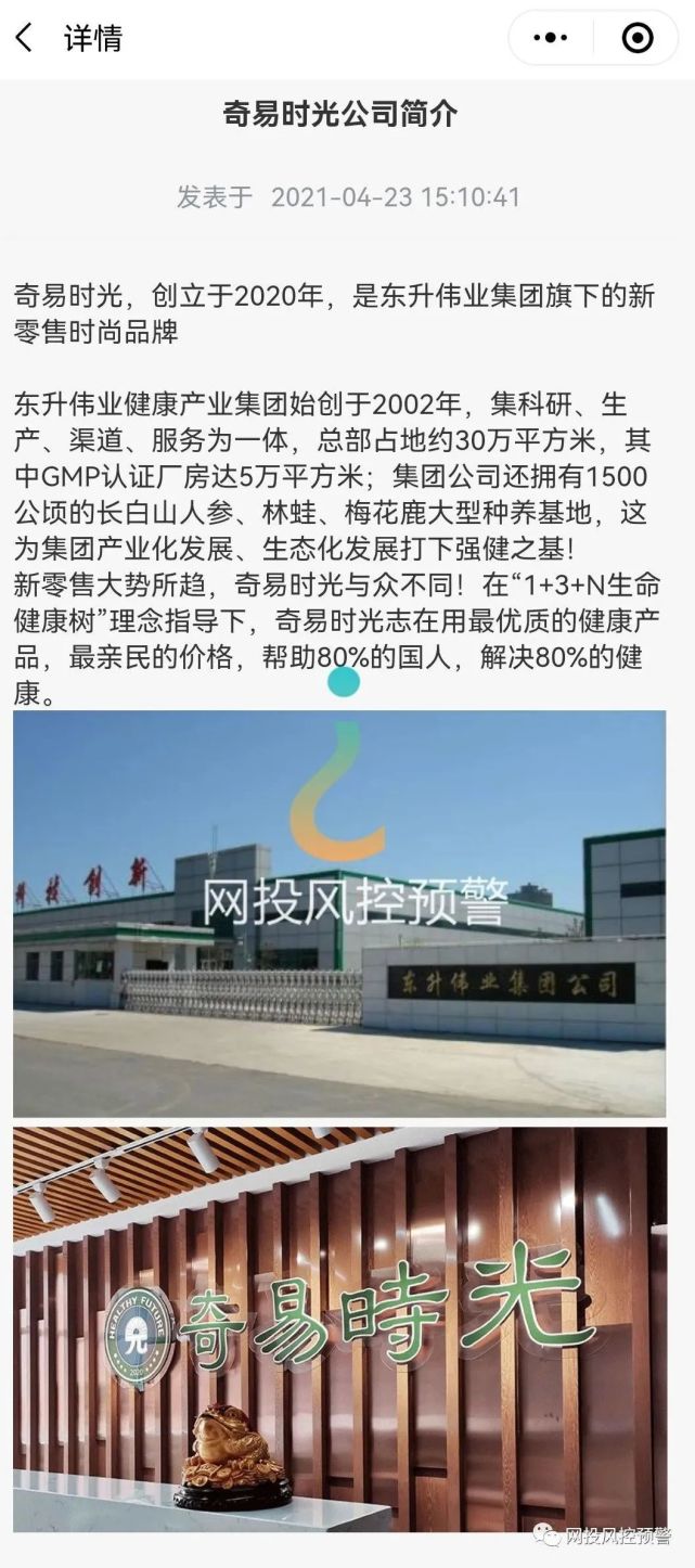 在东升奇易时光小程序商城中发布于2021年4月23日的一则题为《奇易时光公司简介》一文中写道:奇易时光,创立于2020年,是东升伟业集团旗下的新零售时尚品牌。