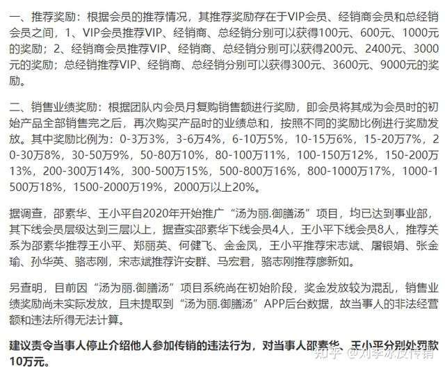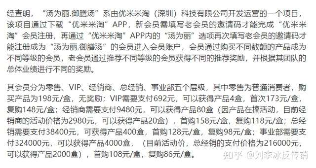 与被投诉掉的新闻进行了对比,据原行政处罚文书显示,经查明,“汤为丽.御膳汤”系由优米米淘(深圳)科技有限公司开发运营的一个项目,该项目通过下载“优米米淘”APP,新会员需填写老会员的邀请码才能完成“优米米淘”会员注册,再通过“优米米淘”APP内的“汤为丽”选项再次填写老会员的邀请码才能注册成为“汤为丽.御膳汤”的会员进入会员账户,会员通过购买不同数额的产品成为不同等级的会员,老会员通过推荐不同等级的会员获得不同的推荐奖励,并根据其团队的总体业绩进行不同的奖励。