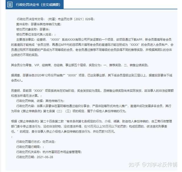 据其中杭富市监罚处〔2021〕026号显示,经查明,“XXXX”系由XXXX有限公司开发运营的一个项目,该项目通过下载APP,新会员需填写老会员的邀请码才能完成“会员注册,再通过APP内的选项再次填写老会员的邀请码才能注册成为“XXXX”的会员进入会员帐户,会员通过购买不同数额的产品成为不同等级的会员,老会员通过推荐不同等级的会员获得不同的推荐奖励,并根据其团队的总体业绩进行不同的奖励。