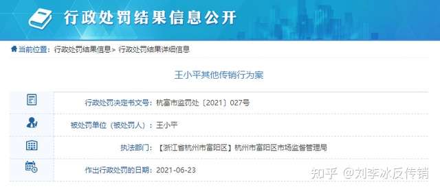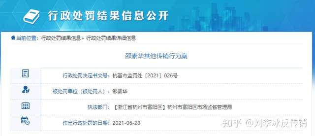 令人疑惑的是,该内容出自杭州市富阳区市场监督管理局做出的行政处罚文书。该行政处罚文书于今年6月28日公布在浙江政务服务网,其行政处罚决定书文号分别是杭富市监罚处〔2021〕026号与杭富市监罚处〔2021〕027号。