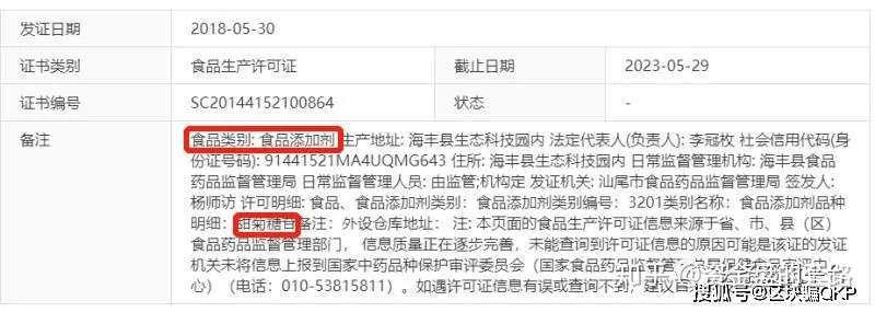 但据启信宝显示,冠龙生物科技在“资质认证”这一板块上所获得的食品生产许可证号为“SC20144152100864”,对应的食品类别属于食品添加剂,品种明细为甜菊糖苷。正如上文所述,甜菊糖苷一般指的就是甜菊糖,由此可见,冠龙生物旗下的“甜菊糖苷”产品属于普通食品,因而不能对外宣传保健功效。