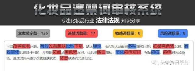 这段文字宣传得有多夸张?当用户把这段宣传语输入“化妆品违禁词审核系统”平台并经审核后,我们发现这段话中的违禁词数量达17个,风险词数量为8个。
