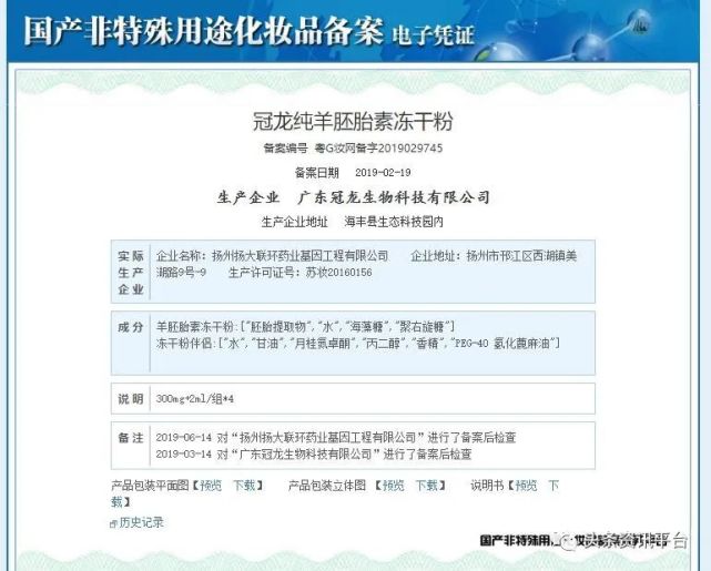 在上篇报道中,我们了解到了冠龙生物公司旗下的多款茶叶产品存在着怎样的宣传问题,在本篇报道中,我们将主要关注的是该公司名下的护肤产品——“羊胚胎素冻干粉”。