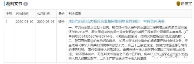 这件事的起因见诸于《周某与扬州扬大联环药业网络购物合同纠纷一审民事判决书》。据相关裁判文书显示,周某在2018年12月22日通过天猫商城网络购物平台购买了该公司销售的可易羊胚胎素冻干粉,用去2490元。该公司的销售页面上也载明了涉案产品含有表皮生长因子(EGF)、碱性纤维细胞生长因子(BFGF)、透明质酸刺激因子(HASF)、超氧化物歧化酶(SOD)等成分。