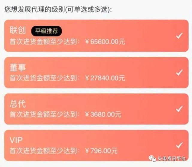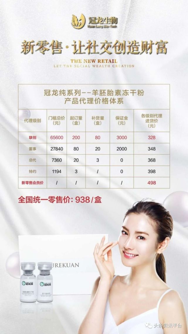 据知情人透露,冠龙生物旗下的羊胚胎素冻干粉的全国统一零售价为938元一盒。其代理制度可谓简单明了,除去新零售会员之外,该款产品的代理级别从低到高分别是特约、总代、董事、联创,共四级。