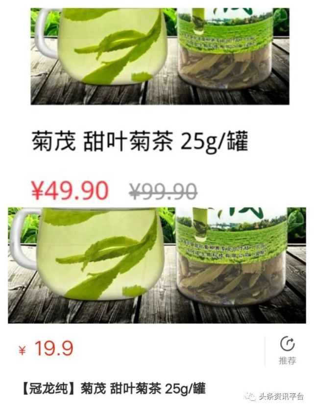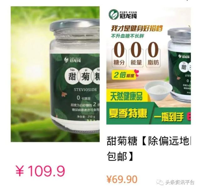 如今,在其他电商平台上,冠龙生物名下的同款产品的售价也各不相同。比如甜叶菊茶,官方对该产品标注的零售价为49.9元,但在某平台上它的售价仅为19.9元。又比如甜菊糖,它在冠龙商城上的标价仅为69.9元,但在某平台上它的售价却高达109.9元。