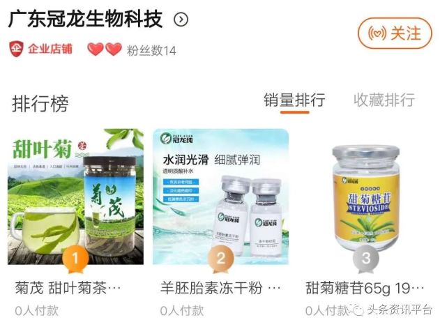 另外值得一提的是,冠龙生物科技在淘宝网上开设的店铺的粉丝仅为14人,而且处在该店铺排行榜前三位置的产品竟然也都为0人付款。