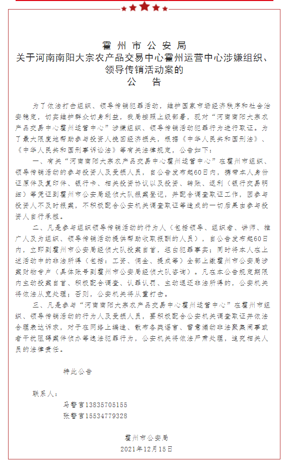 一、有关“河南南阳大宗农产品交易中心霍州运营中心”在霍州市组织、领导传销活动的参与投资人及受损人员,自公告发布起60日内,携带本人身份证原件及复印件、银行卡、相关投资协议以及投资、转账、返利(银行交易明细)等凭证到霍州市公安局经侦大队报案登记,并配合调查取证工作,因参与投资人不及时报案,不积极配合公安机关调查取证等造成的一切后果由参与投资人自行承担。