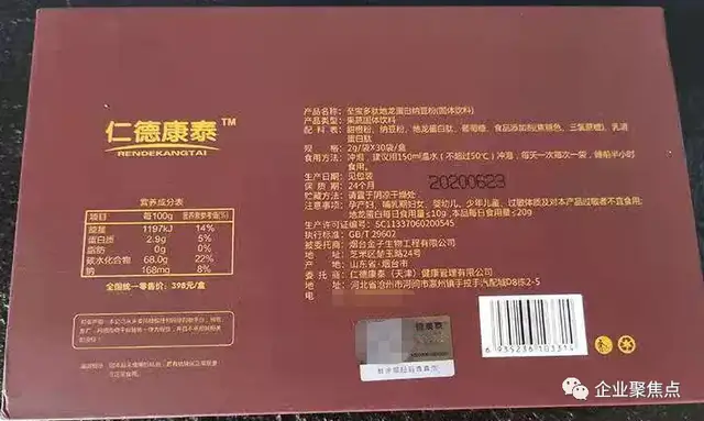 据悉,至宝多肽是仁德康泰(天津)健康管理有限公司(简称仁德康泰)旗下一款产品,该公司成立于2015年6月23日,注册资本600万元,实缴10万元,法人代表为路丙申,老板叫路领群。