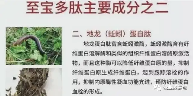 然而,市场中,至宝多肽销售人员宣称得最多的就是至宝多肽有发明专利,药食同源,含有水蛭、蚯蚓、纳豆等提取物。