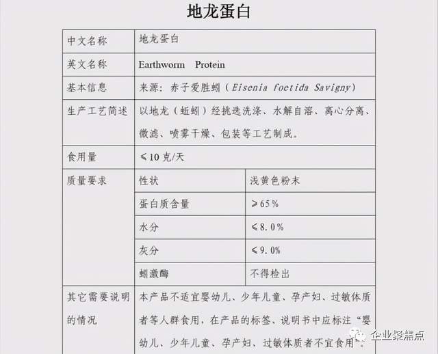 值得一提的是,据卫生部2009年第18号公告,地龙蛋白被批准为新资源食品,地龙(即蚯蚓)经挑选洗涤、水解自溶、离心分离、微滤、喷雾干燥、包装等工艺可制成地龙蛋白,每天使用量不能大于10克,并且对质量有严格要求:不得检出蚓激酶。