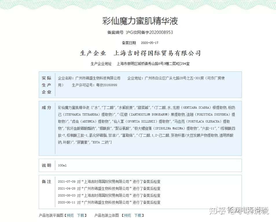 微商电商调研登陆了国家药品监督管理局官网,在国产非特殊用途化妆品备案信息查询发现,彩仙魔力蜜肌精华液的实际生产企业为广州市锦盛生物科技有限公司,该款产品的主要成分为:水、丁二醇、水解胶原、甜菜碱、龙胆根提取物、粉防己提取物、花椒果提取物、连翘提取物、卤虫提取物、仙人掌、提取物、马齿苋提取物、抗坏血酸磷酸酯钠、烟酰胺、聚谷氨酸、极大螺旋藻提取物、六肽-11、棕榈酰四肽-7、棕榈酰三肽-1、氢化卵磷脂、甘油、富勒烯、丁二醇、2-己二醇、芽孢杆菌/大豆发酵产物提取物、透明质酸钠、叶酸、尿囊素、EDTA二钠。