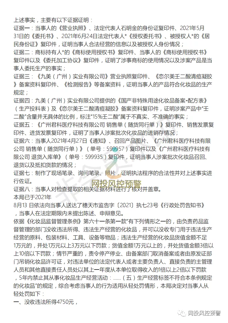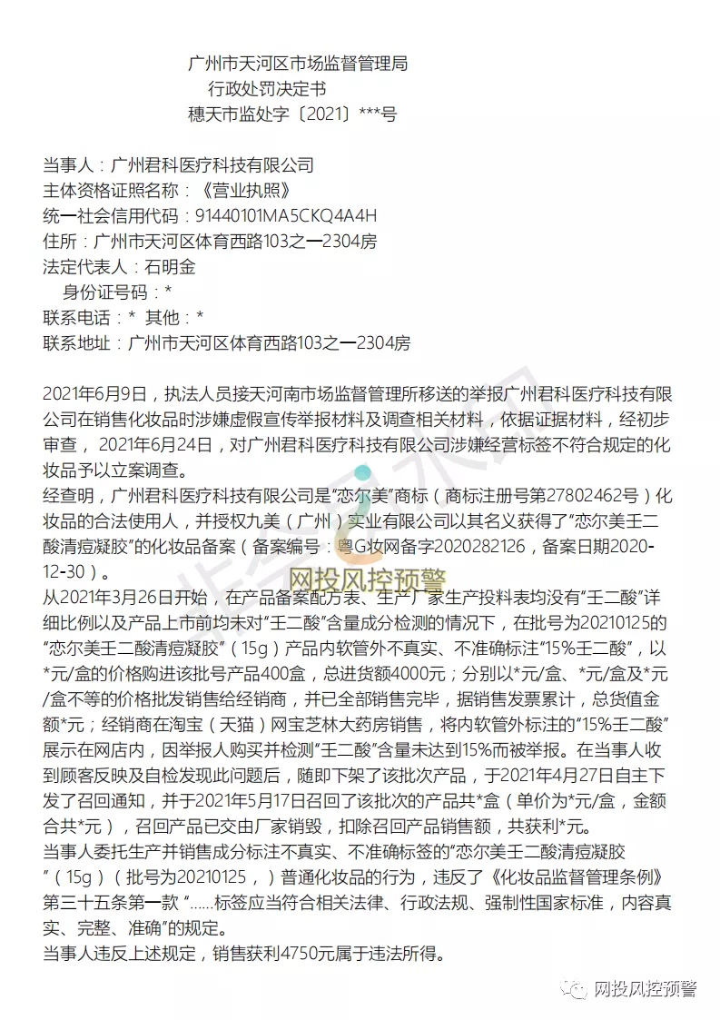http://www.junkeyiliao.com/、www.lianermei.cn),广州君科医疗科技有限公司为医用修护敷料/医用耗材供应商,其主要产品品牌为“恋尔美”,而此次涉事遭受处罚的即为“恋尔美壬二酸清痘凝胶。”