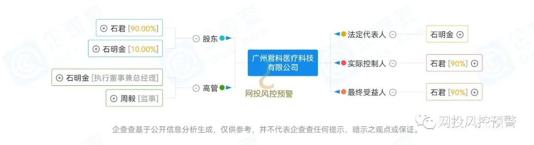 根据企查查APP数据显示,广州君科医疗科技有限公司成立于2018年12月25日,法人石某某持股10%;大股东石某持股90%;注册资本300万元,实缴-;根据备案网站显示(网址: