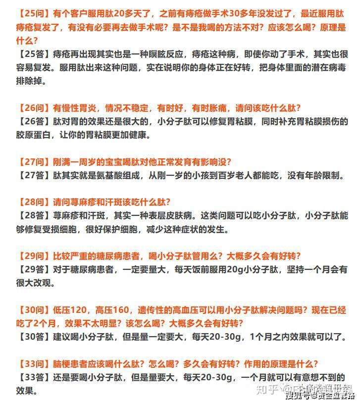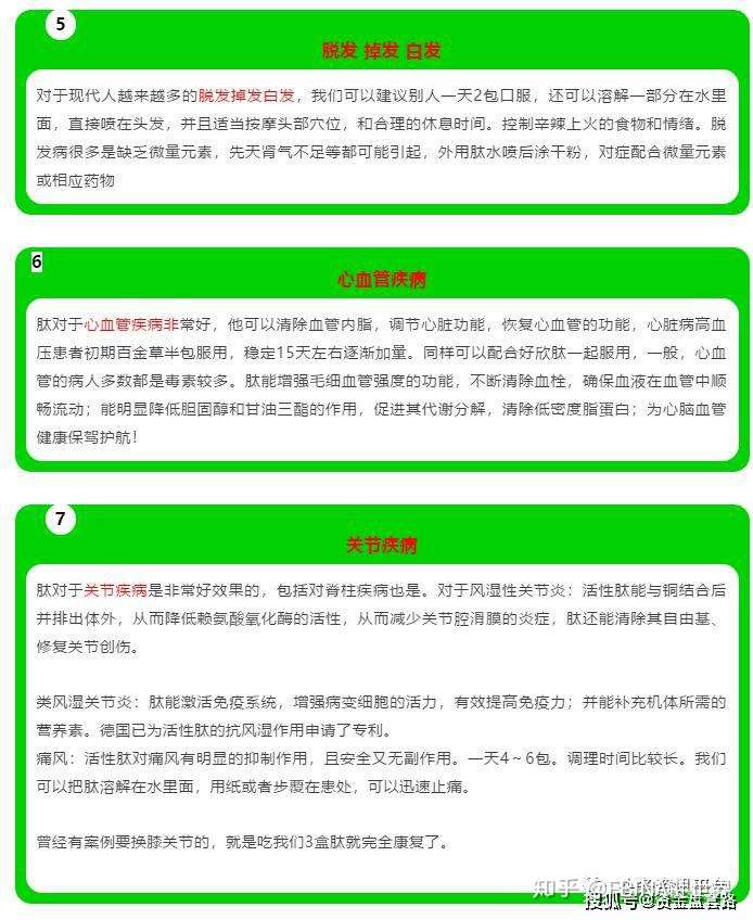 在萨依娜公司的宣传下,小分子肽和肽都可以对多种疾病(脱发、心血管疾病、关节疾病、痔疮、慢性胃炎、脑梗等)的治疗有着一定程度的作用。