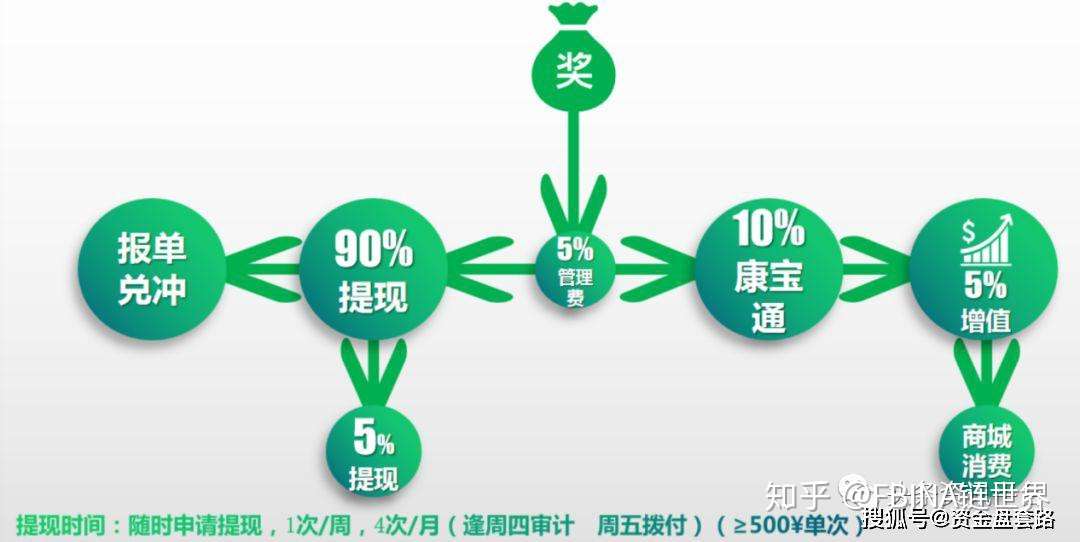 奖金5%平台管理费,90%提现,提现收取5%服务费;10%康宝通。用户可进入区块链商城(目前该商城尚未上线,也就是说,该模式中所谓的区块链和新电商的部分尚未正式走向市场)进行增值(可消费、可变现)。