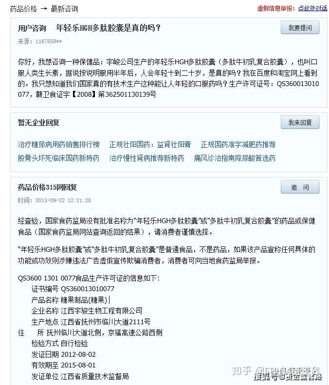 曾有网友在网上咨询“宇峻公司生产的年轻乐HGH多肽胶囊(多肽牛初乳复合胶囊),也叫口服人类生长素,据说按说明服用半年后,人会年轻十到二十岁,是真的吗?我只想知道我们国家真的有技术生产这种能让人年轻的口服药吗?”的问题,经查,此产品的生产许可证号为QS360013010077,赣卫食证字【2008】第362501130139号。(另外一款由相关公司出品的“HGH胶囊”的生产许可证号为SC11336100210013,同样也是普通食品。)