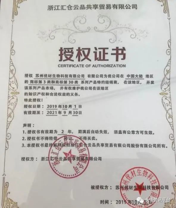 据另外一份《品牌授权书》显示,广州康麦谷医药科技有限公司为美国至高无上品牌管理集团有限公司拥有的“Supreme”商标在大陆范围内的品牌总代理,于2019年授权浙江汇仓云品共享贸易有限公司负责在中国大陆销售商标30类(申请号:39005418)、32类(申请号:38998442)等。也就是说,美国品牌“Supreme”被先授权给了广州康麦谷医药科技有限公司,后又被康麦谷授权给了汇仓云品公司,汇仓云品公司又授权给了优材生物公司。