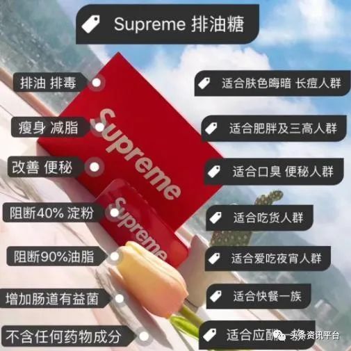 对于有关宣传材料声称潮瘦排油糖具有减肥功效的现象,药品价格315网认为:在“supreme潮瘦果纤咀嚼片压片糖果”名称中出现中的“压片糖果”,是普通预包装食品的一个分类,只要是名称中写了“压片糖果”的一般不会是药品或保健食品,而属于普通食品。普通食品没有具体的保健功能或治疗功效,请消费者谨慎选择。“Supreme潮瘦排油糖”可能是该产品在广告中使用的名称。部分网站对“Supreme潮瘦排油糖”的描述“Supreme排油糖是一种果纤咀嚼糖,它可以通过排除体内油脂和毒素达到减肥和预防肥胖的效果,抗糖阻糖同时还具有美容养颜的功效,让我们的肠道更健康。Supreme潮瘦自推出以来,新颖独特的产品定位让它迅速在市场上火爆起来,完美解决了‘怕油腻,想吃肉’的吃货痛点”等内容宣称预防肥胖或减肥功效,涉嫌违法广告虚假宣传欺骗消费者,请消费者不要轻信。