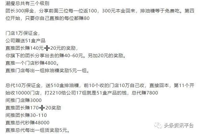 在上篇报道中,我们了解到了和优良品主推的“纤立瘦多肽新主食”被宣传为具有哪些功效,以及该产品实际上所具有的是怎样的资质,在本篇报道中,我们将关注的是从“潮瘦排油糖”到“抱瘦排油糖”,相关产品的运营方走过了一条怎样的发展之路,以及和优良品现行的奖金制度有着怎样的特色。