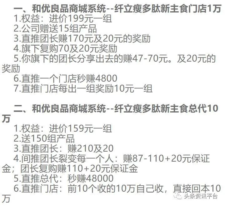 具体有哪些权益呢?据《和优良品商城系统源码开发》显示,消费10万元成为总代,可以获得以下六种权益:1.进价159元一组;2.送150组产品;3.直推团长:赚210+20元;4.间推团长裂变每一个人:赚87~110+20元;团长复购赚110+20元;5.直推总代:秒赚4.8万元;6.直推门店:前10个收的10万自己收,直接回本10万元。