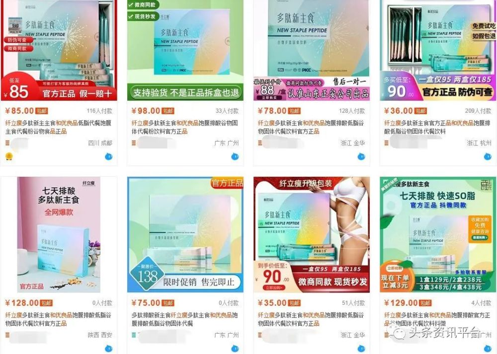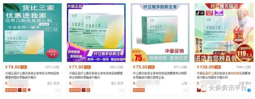 顺带一提,对于在和优良品商城上零售价高达333元一盒的“纤立瘦”来说,在某电商平台上不同的店铺中,这样一款产品却有着千差万别的标价。有35元的,有75元的,有85元的,有98元的,还有128元的和138元的。由此推断,在和优良品的销售市场中,乱价现象可能已然存在。