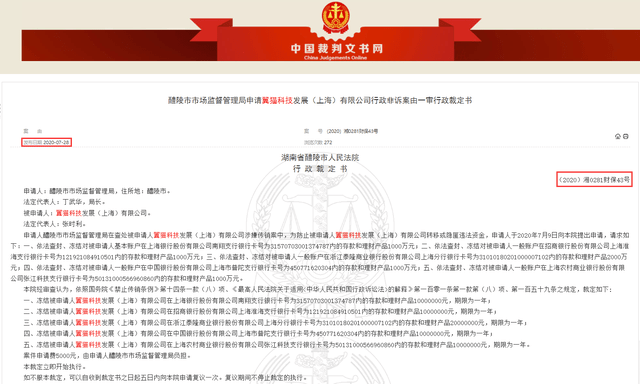 北青网健康注意到,这是翼猫科技在去年(2020)7月28日,因涉嫌传销被裁定冻结6000万元账户一年后,被裁定续冻一年。去年的裁定书标题为《醴陵市市场监督管理局申请翼猫科技发展(上海)有限公司行政非诉案由一审行政裁定书》案号为(2020)湘0281财保43号。