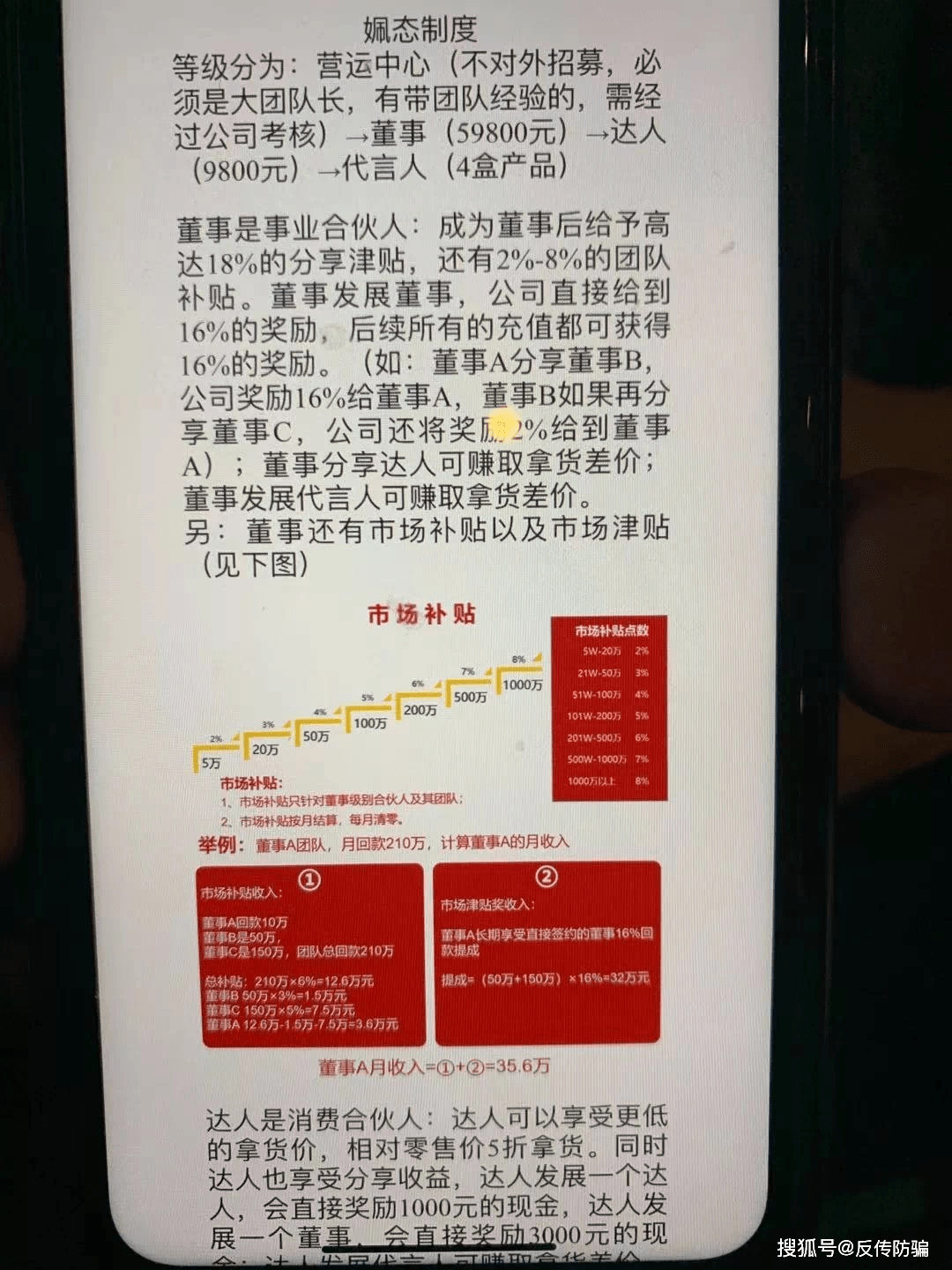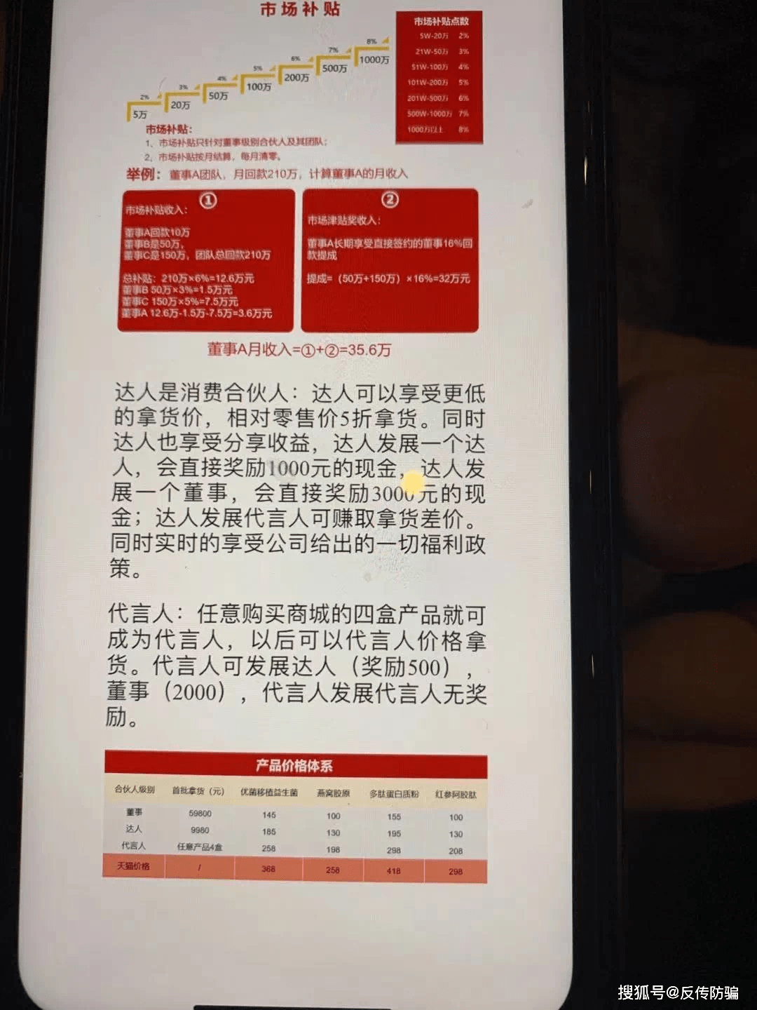 据透露,姵态现行的奖金制度和上述内容已经出现了一些出入,比如图中出现了营运中心、董事、达人和代言人共四个级别,目前变成了两个级别,且最高级别叫运营中心,而不是上图中的营运中心,不过这个级别也同样是需要官方考核的,不对外招募(这个说法待验证),除了运营中心之外,就剩下了董事和代言人这两个级别,门槛分别是59800元和4盒产品以上,前者有发展市场的机会,后者就纯粹是自用省钱。至于推荐奖,董事A推荐董事B有16%奖励,董事B推荐董事C,董事A能从中拿到2%奖励等说法依然不变。