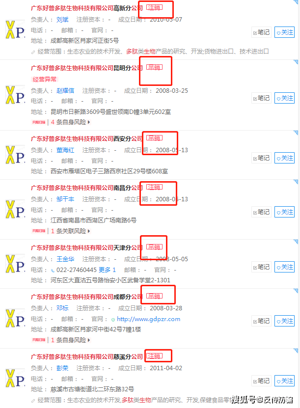 要了解姵态,首先要了解它背后的公司——广东好普多肽生物科技有限公司。不查不知道,一查吓一跳,该公司旗下的多家分支机构居然都被列入经营异常或被行政处罚。