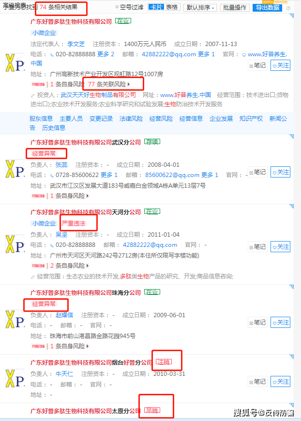 道道粗略统计了一下,广东好普多肽生物科技有限公司旗下的分公司居然有73家之多,但其中70家都已处于吊销或注销的经营状态,仅剩下的3家呢,天河分公司被列入严重违法企业名单,武汉分公司和珠海分公司皆处于经营异常状态。