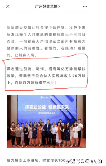 公众号“广州好普艺博”在2020年7月27日的一篇文章中有这样一段描述:“姵态通过引流、动销、招商等亿万势能帮扶政策,帮助数千位合伙人实现年收入20万以上,百位百万领袖横空出世。”