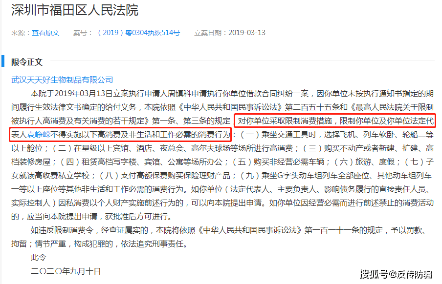 同时,道道也留意到,广东好普多肽生物科技有限公司的大股东——“武汉天天好生物制品有限公司”也是风险颇多,已多次被法院公示为被执行人。其法定代表人更是在2020年因“未按执行通知书指定的期间履行生效法律文书确定的给付义务”被深圳市福区人民法院限制高消费。