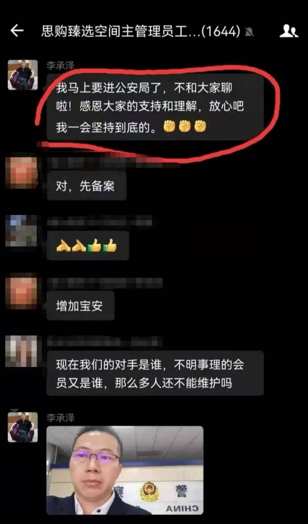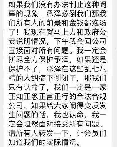 与此同时,李承泽在群内发表长文,恩威并施。一边表示“公司小伙伴在拼命努力把工作做的更好,企业发展的更好。”针对前来维权的情况,他表示“如果我们没有办法制止这种闹事现象,承泽必倒我们那我们所有人的前景和金钱都泡汤了......”