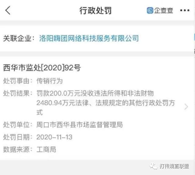 但据部分留存下来的行政处罚决定文书显示,经查,当事人洛阳嗨团网络科技服务有限公司2019年元月开始,利用嗨团团购微信平台等方式,在开展销售活动时采取按照一定顺序组成层级,分级发展,在吸收会员时以购买一定数额的商品作为加入资格;上级对发展的各个下级的营销单数采取分层返利、团队计酬的方式运营,激励发展下线,目前已达到3级16层,销售商品上千种,人员达255592人次,涉及29个省市。