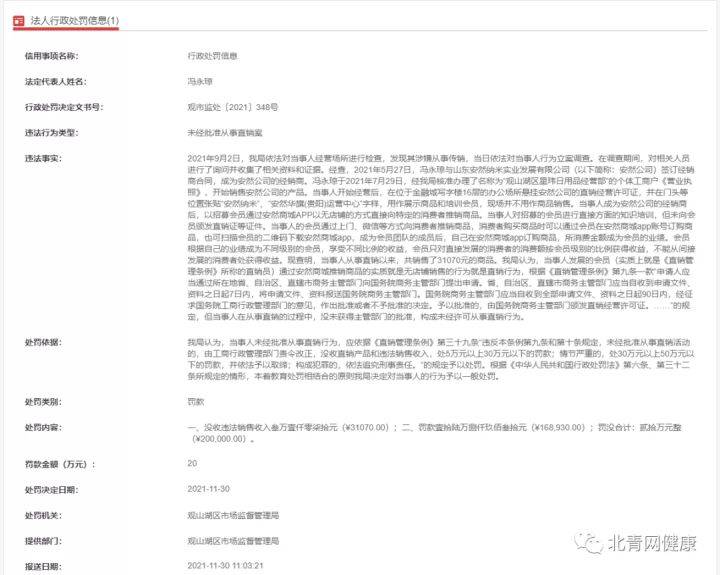日前,北青网健康在信用中国(贵州)上发现一则行政处罚信息。显示为,观山湖区星玮日用品经营部因未取得直销员证,擅自开展直销活动,被贵阳市观山湖区市场监督管理局处以罚款16.893万元,并没收违法所得3.107万元。此外,处罚通知还显示,观山湖区星玮日用品经营部为直销企业安然纳米的经销商。