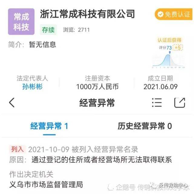 根据“企查查”显示浙江常成科技有限公司,注册于2021年06月09日,注册资本1000万元,法人代表:孙彬彬,刚注册没多久的企业,相隔四个月就被列入经营异常,原因是无法联系经营住所。