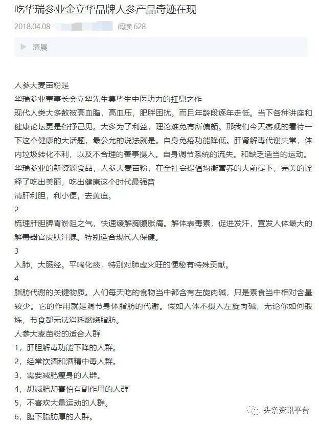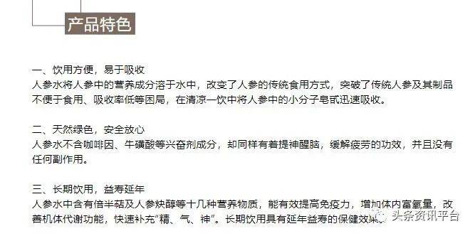 最近,华瑞参业还推出了一款名为“人参水”的产品,公众号“吉林传播”在介绍该产品时,使用了这样的字眼:人参水不含咖啡因、牛磺酸等兴奋剂成分,却同样有着提神醒脑,缓解疲劳的功效,并且没有任何副作用。长期饮用,可益寿延年,人参水中含有倍半萜及人参炔醇等十几种营养物质,能有效提高免疫力,增加体内富氧量,改善机体代谢功能,快速补充“精、气、神”。