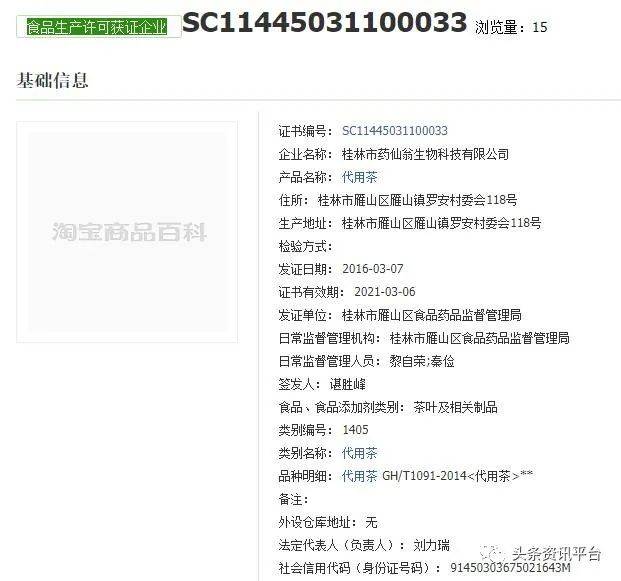 但该产品的生产许可证编号为SC11445031100033,类别名称为代用茶,该产品同样也是不能被宣传任何功效的普通食品。