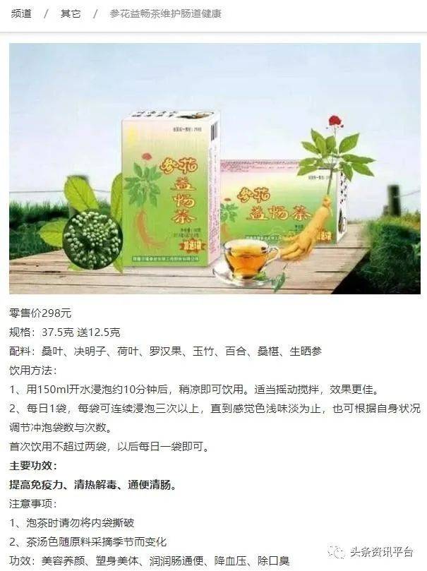 “华瑞参业参花益畅茶养生茶”也存在类似的状况,有经销商表示,该产品有“提高免疫力、清热解毒、通便清肠、美容养颜、塑身美体、润肠通便、降血压、除口臭”等功效。